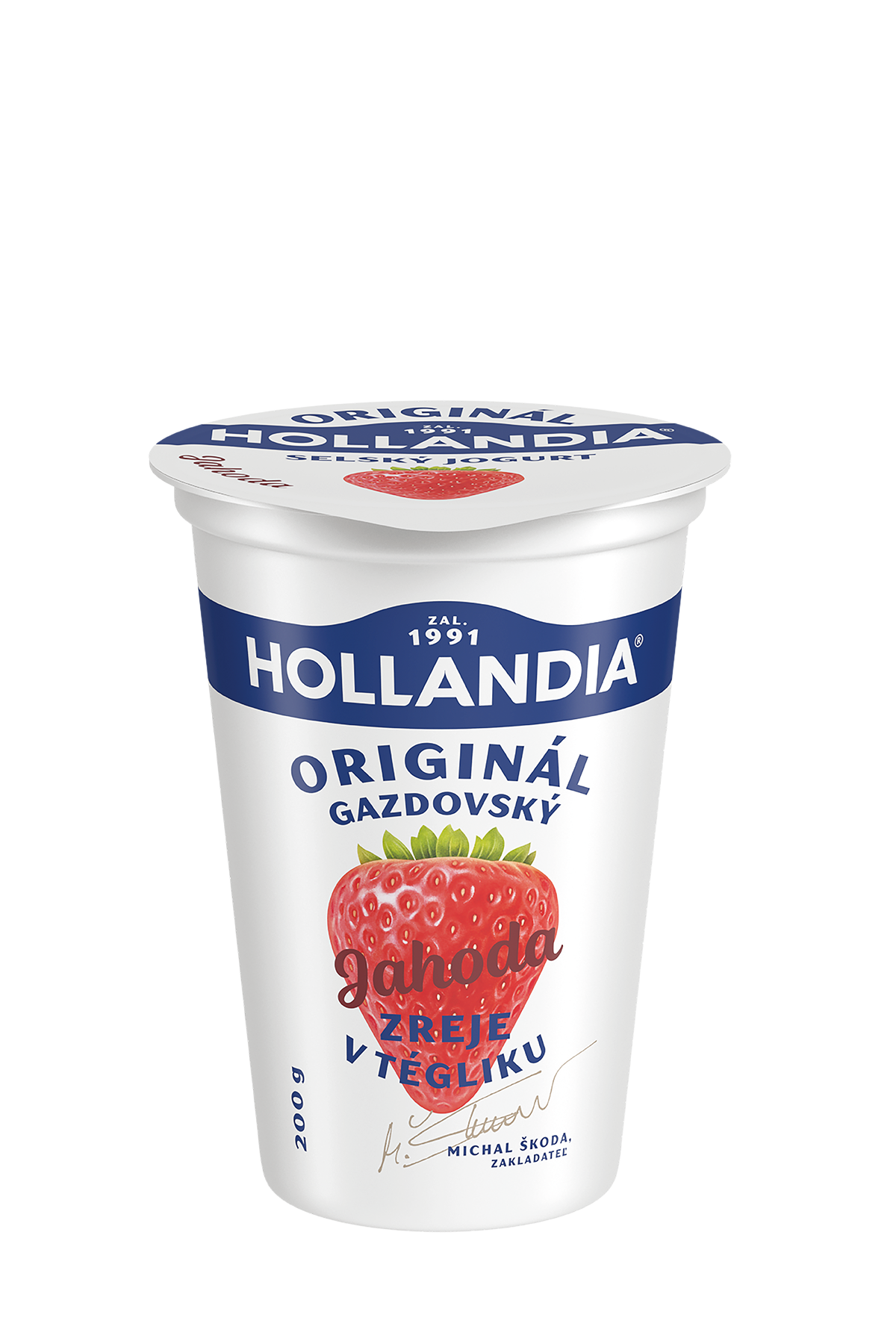 Gazdovský jogurt vyrábaný tradičným spôsobom, zrením mlieka v tégliku s prídavkom zdraviu prospešných baktérií Bifidobacterium a Lactobacillus acidophilus. Jahodová zložka je 100% prírodná a z 55 % ju tvoria kúsky jahôd